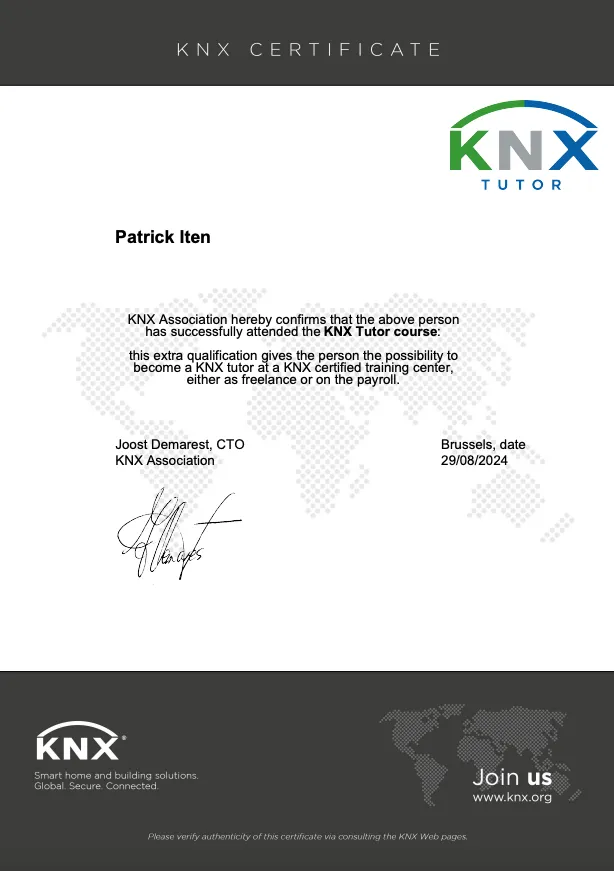 Unsere Kompetenz in der Gebäudeautomation ist zertifiziert: Patrick Iten, Inhaber der EPZ AG, ist offiziell geprüfter KNX Systemintegrator. Das KNX-Zertifikat bestätigt seine fundierte Ausbildung in der Planung, Programmierung und Inbetriebnahme von intelligenten Gebäudesteuerungen.